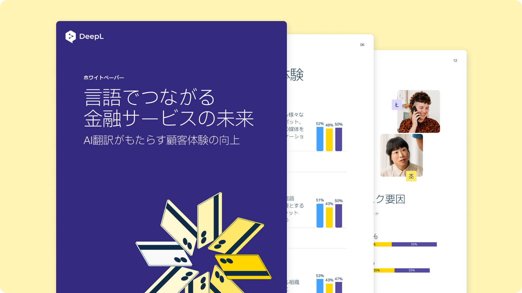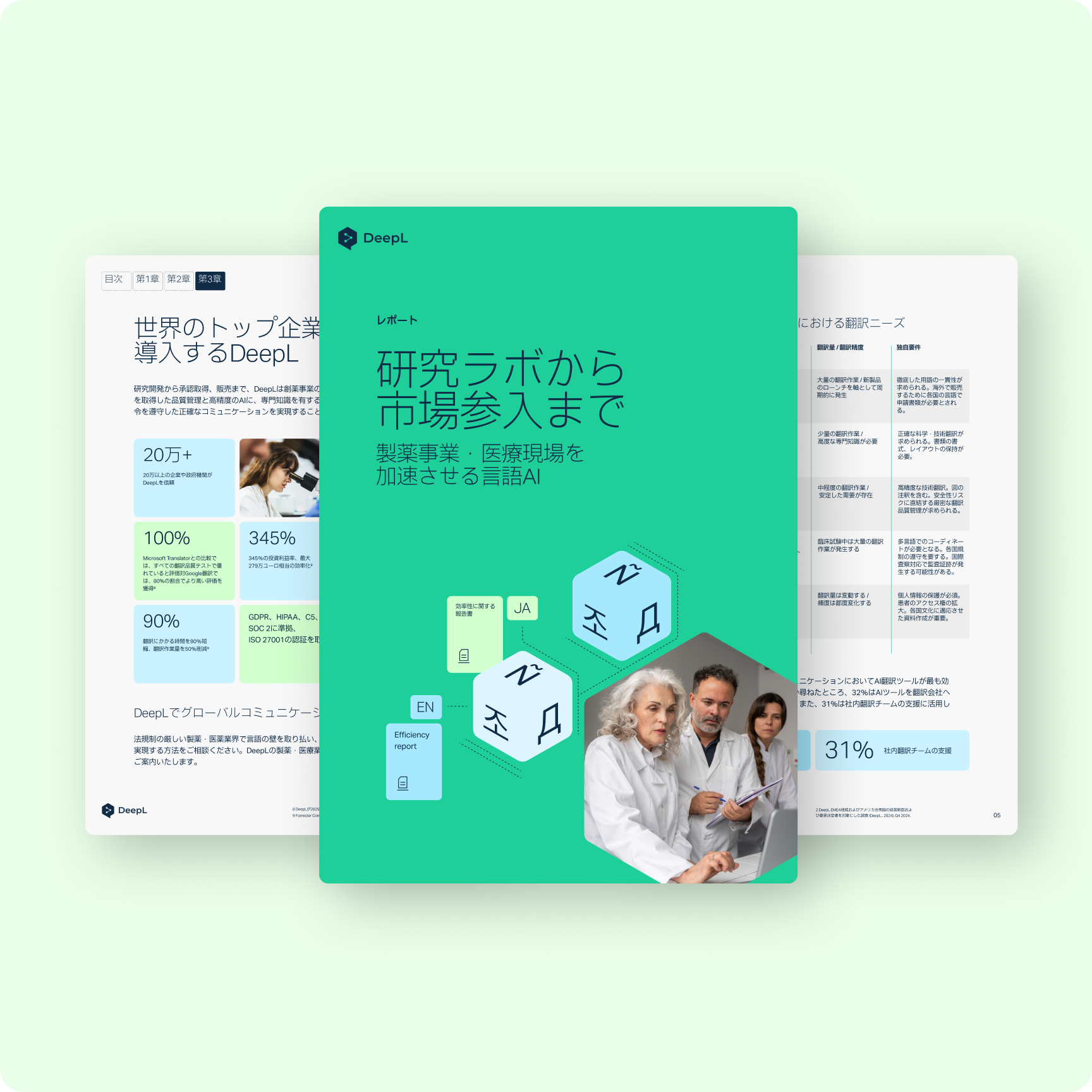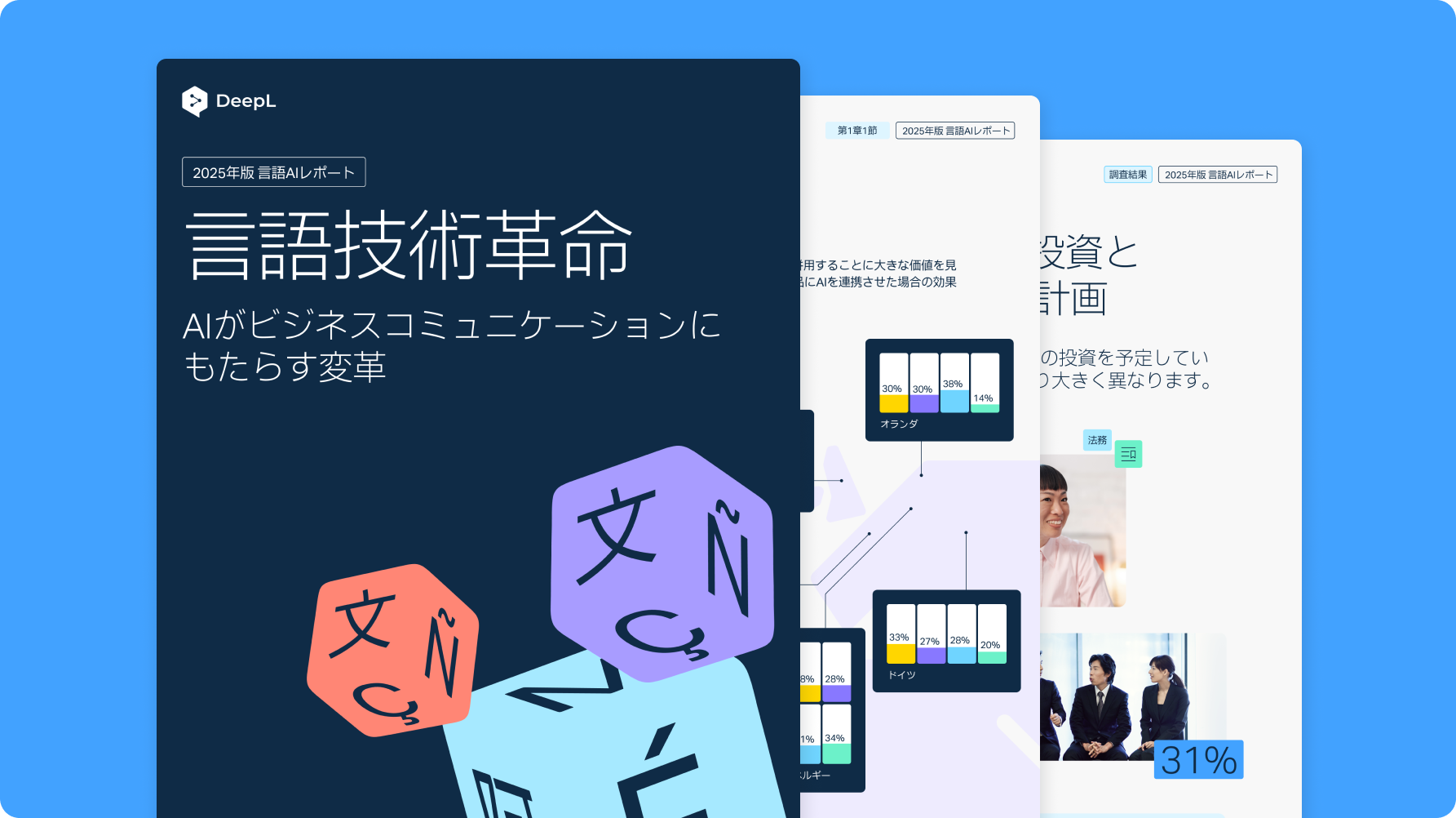 DeepLのレポートおよびガイドでは、企業が直面するコミュニケーションの課題を言語AIがどのように解決し、正確性と一貫性を確保しながら業務効率を向上させるかを解説しています。具体的な活用事例や実践的な手法をご覧になり、ぜひコミュニケーションの変革にお役立てください。